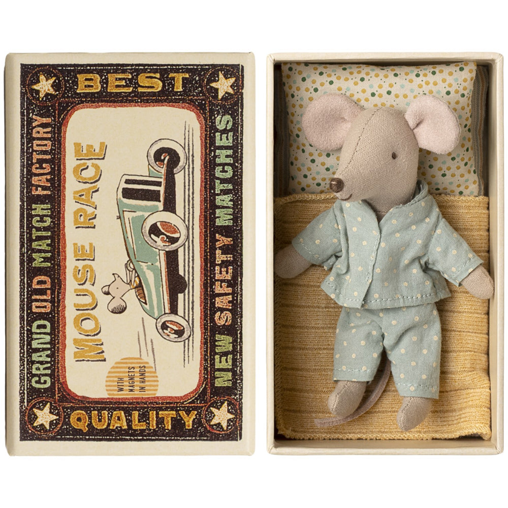 Upplev glädjen i lekfulla äventyr med Maileg Lillebror Mus i Tändstikæske, en oemotståndlig tygdocka som inspirerar till kreativitet. Denna lilla mus är inte bara en kär gammal vän utan även en säker kamrat för ditt barn. Dess mjuka material och varligt utformade detaljer, inklusive kläder och sängkläder tillverkade av mjukt tyg med unika, estetiskt tilltalande tryck, säkerställer en trygg känsla vid varje kram.