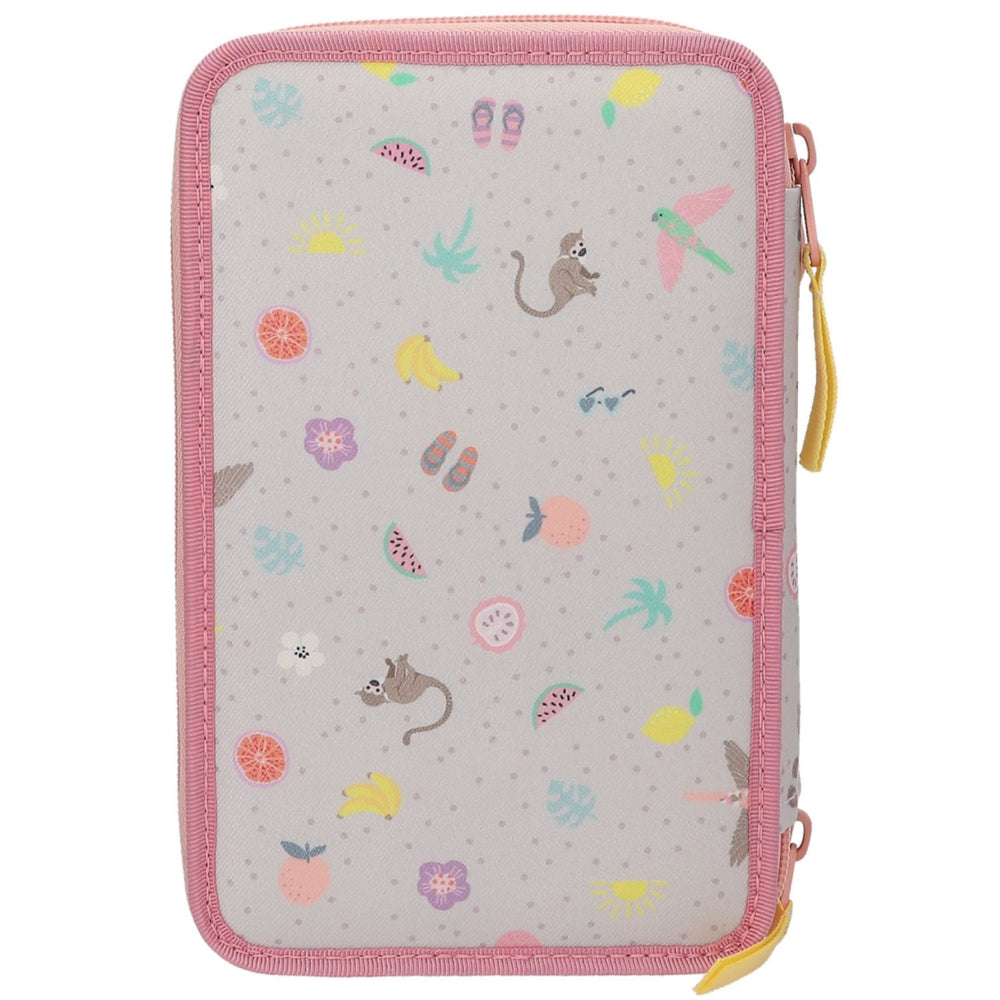 Pennfodralet är designat med ett lekfullt djur- och frukttema med en charmig liten apa på framsidan och ett mönster av prickar, blommor, och sommartillbehör. Den robusta konstruktionen med sydda kanter och tåliga dragkedjor i textil säkerställer att fodralet håller länge även med dagligt bruk. Tillverkat i 100% PES, är det lätt att underhålla och håller sig rent och fräscht.