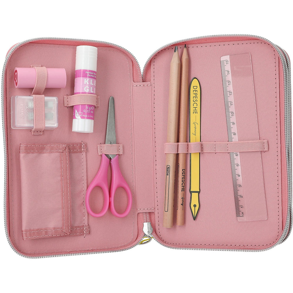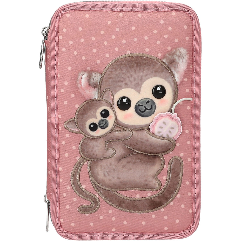 Det skärmrosa tredubbla pennfodralet från TOPModel med sina charmerande orange prickar och en bedårande apa med en babyapa design gör det här till ett oemotståndligt val för barn. Tillverkat i 100% polyester och fullt utrustat med 18 färg- och filtpennor, 2 blyertspennor, pennvässare, suddgummi, linjal, sax, och limstift. Dess unikt designade fruktgimmick gör att den kan positioneras som att apan håller i den, vilket ger både stimulans och underhållning. De tre separata facken bidrar till enkel organisation och förvaring, samtidigt som de möjliggör enkel åtkomst och bidrar till barnets självständighet. Idealisk för daglig användning, både i skolan och hemma, garanterar detta pennfodral både komfort och nöje.