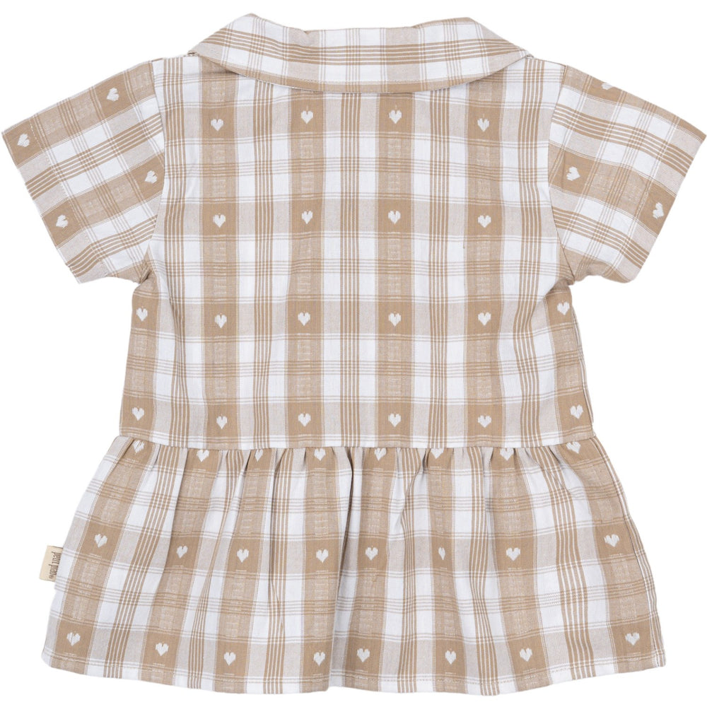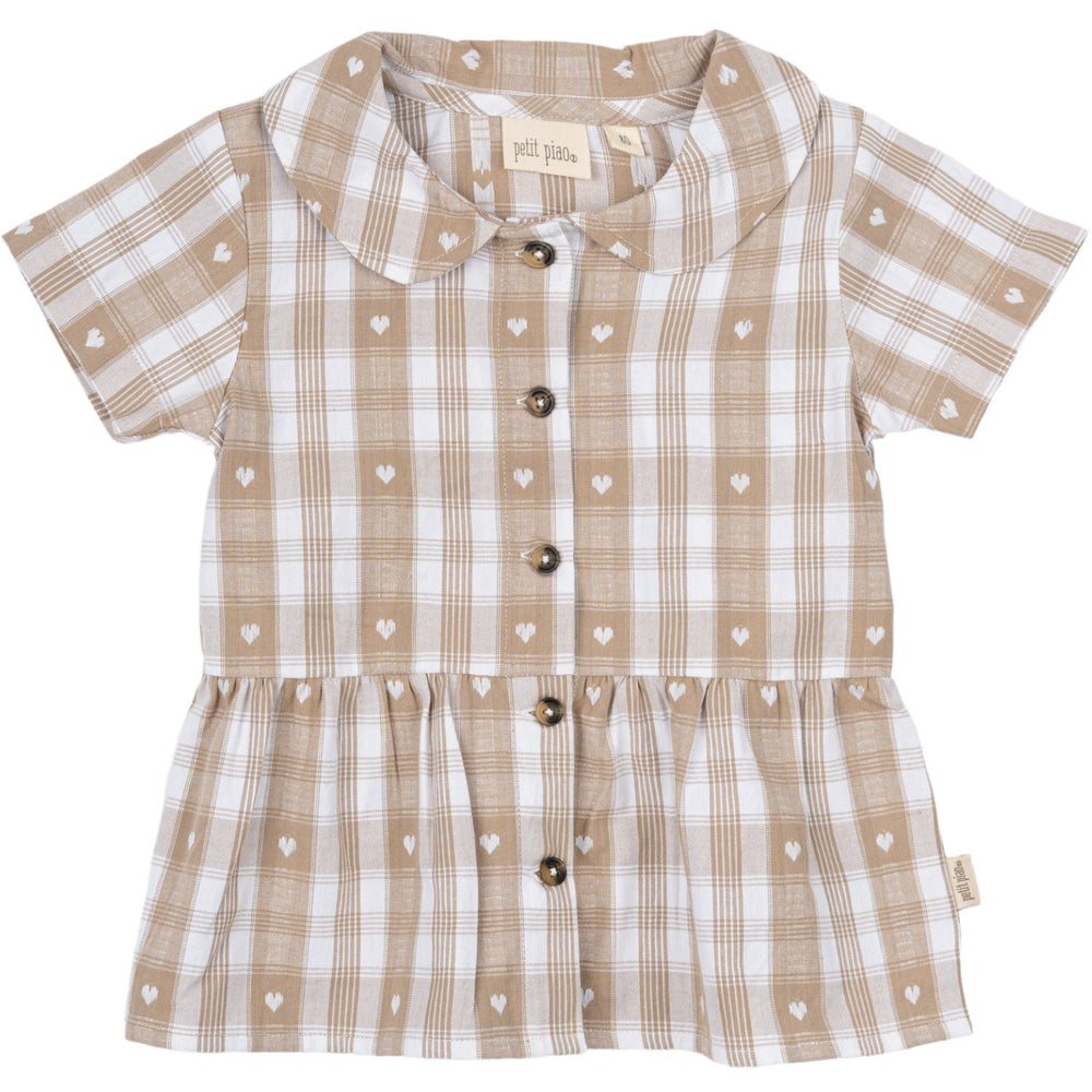 Låt din lilla solstråle flöda i denna charmiga kortärmade skjorta från Petit Piao! Skjortan skämmer bort med ett hjärtevärmande rutmönster prydd med söta hjärtan. Den runda kragen ger en touch av söthet, medan de fina rynkorna i midjan ger en lekfull look. Med praktiska knappar på framsidan är den här skjortan både snygg och enkel att ta på sig. Perfekt för en dag fylld av äventyr! Tillverkad med omsorg i Indien.