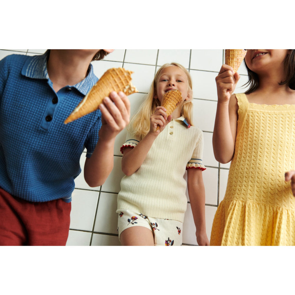 Låt ditt barn klä sig snyggt och hållbart med vår FUB ecru Frill Pikétröja. Denna piké är framställd i 100% certifierad ekologisk bomull, vilket betyder att inga kemiska gödningsmedel eller bekämpningsmedel har använts under odlingen. Tröjan har en unik design med en stickad spetskant i kontrastfärg vid ärm och krage, samt detaljrika pärlknappar och randiga ärmslut som adderar en lekfull touch. Med sin rak smal passform och det mjuka pointellemönstret på både bålen och ärmarna erbjuder den både komfort och stil för alla tillfällen. Idealisk för barn som uppskattar både mode och miljövänlighet.
