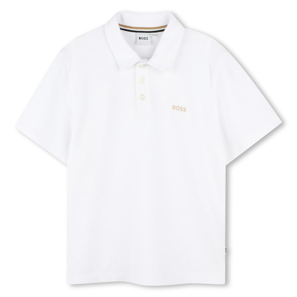 Denna eleganta vita kortärmade pikétröja från Hugo Boss är det perfekta valet för små trendsättare. Pikétröjan är tillverkad i mjuk jersey i 100% bomull och är prydd med en fint broderad logotyp på bröstet, vilket ger en touch av klassisk lyx. Med sin vävda logotyp på sidan är den här pikétröjan inte bara bekväm utan också snygg. Den lösa passformen säkerställer att ditt barn kan röra sig fritt och vara bekvämt hela dagen, oavsett tillfälle.