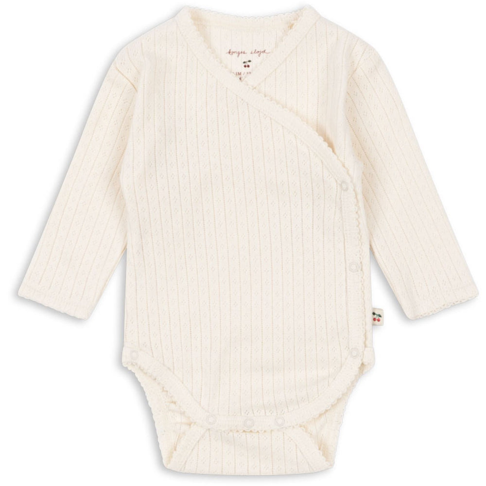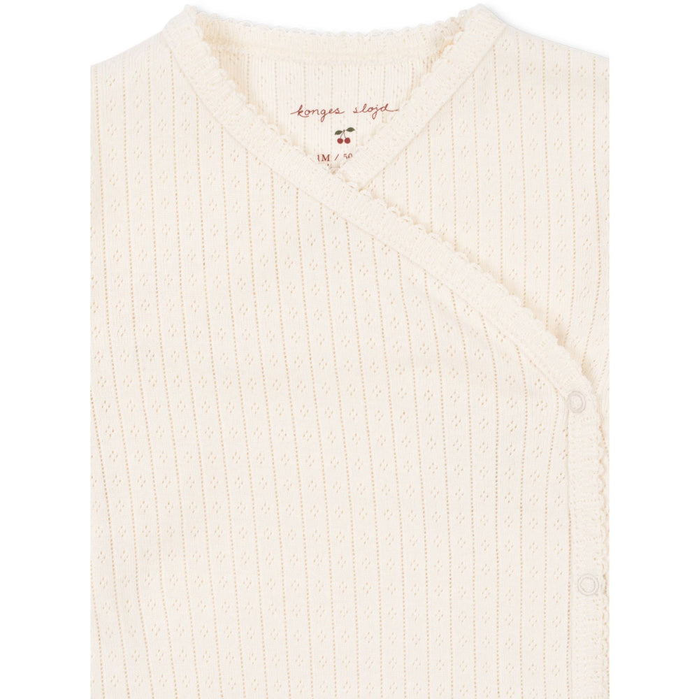 Förvandla din nyföddas garderob med här bedårande bodyn från Konges Sløjd. Tillverkad i 100% ekologisk bomull och GOTS-certifierad, säkerställer den här bodyn både komfort och vänlighet mot känslig hud. Den antika vita färgen kombinerat med minutiöst detaljerade spetsar ger en tidlös känsla, medan det underbara mönstret adderar en charmig touch.