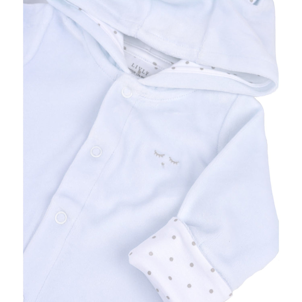 Upplev den mjuka charmen i Livlys ljusblå plyschkaninjump, perfekt för de små. Den här dräkten är tillverkad av kvalitetsmaterial som garanterar värme och komfort hela dagen. Den söta kanindesignen och de mjuka pastellfärgerna gör den bedårande, medan praktiska tryckknappar gör det enkelt att klä på sig. Den är perfekt för både lek och vila och är ett måste i varje liten ängels garderob.