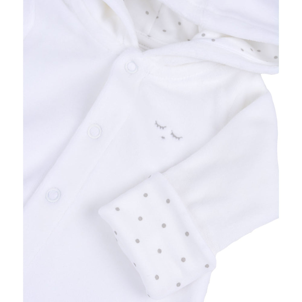 Denna charmiga Livly White Plush Bunny one-piece är perfekt för små som älskar att leka och utforska! Den är tillverkad av en mjuk bomullsblandning och garanterar total komfort och rörelsefrihet. Baddräkten är dekorerad med silvergrå prickar och har praktiska tryckknappar från halsen ner till anklarna för enkel påklädning. Huvan, komplett med söta kaninöron, ger ett stänk av äventyr i vardagen. Perfekt för både lek och tupplurar, och ett bedårande tillskott till alla babygarderober.