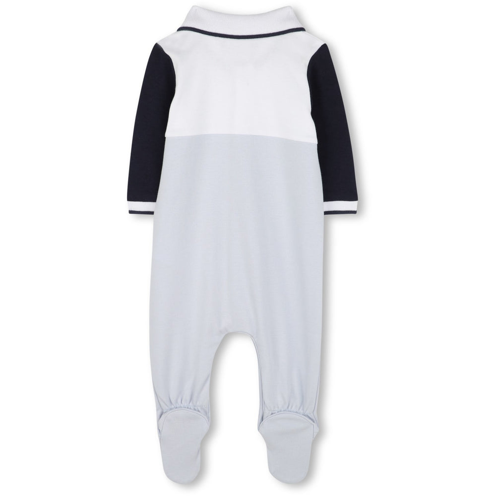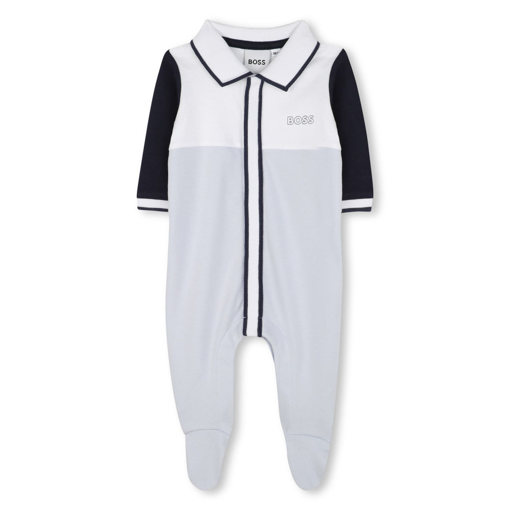 Håll ditt barn mysigt och snyggt hela natten i dessa mjuka, ljusblå pyjamasar från Hugo Boss. Den är tillverkad av 100 % ekologisk bomull och garanterar total komfort och andningsförmåga. Pyjamasen har en chic polokrage i en kontrasterande färg, matchande manschetter och knappslå som ger en touch av elegans. Med "BOSS" tryckt exakt på bröstet och praktiska tryckknappar på framsidan och grenen är dessa pyjamasar både funktionella och moderiktiga - perfekt för de små som förtjänar lyx även i sömnen.