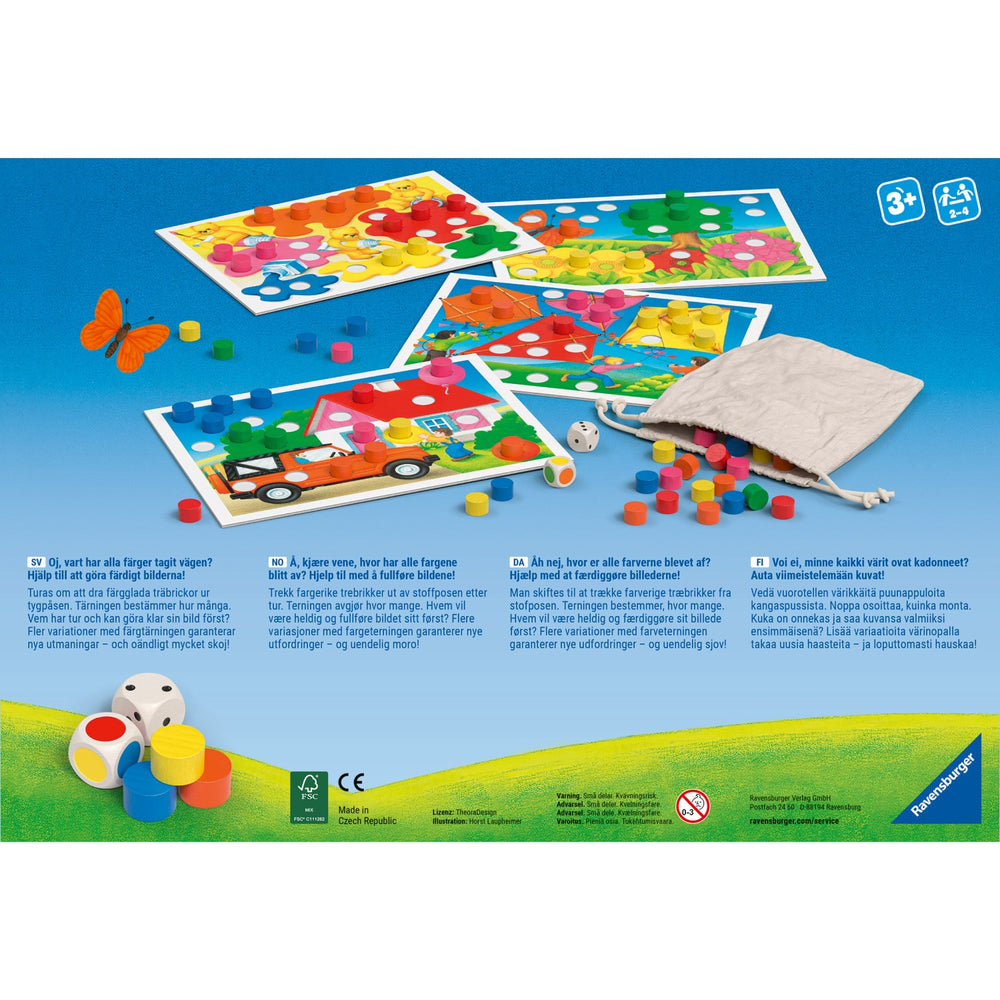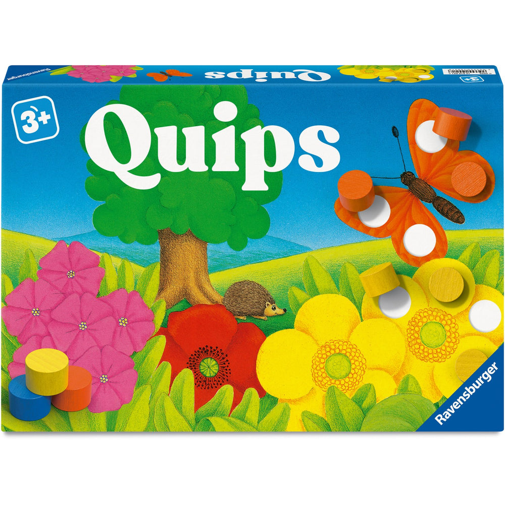 Dyk in i en värld av färger och siffror med Ravensburger "Quips"-brädspelet! Kasta tärningen och se vilken färg du behöver matcha – kan du hitta rätt träblock i tygpåsen? Placera blocken på din spelplan och räkna noggrant hur många som saknas för att fullborda din bild. Från tak till träd, se din spelbild bli levande medan du lär dig om färger och siffror. Perfekt för en rolig lektion hemma. Vem fyller i sin bild först och vinner spelet?