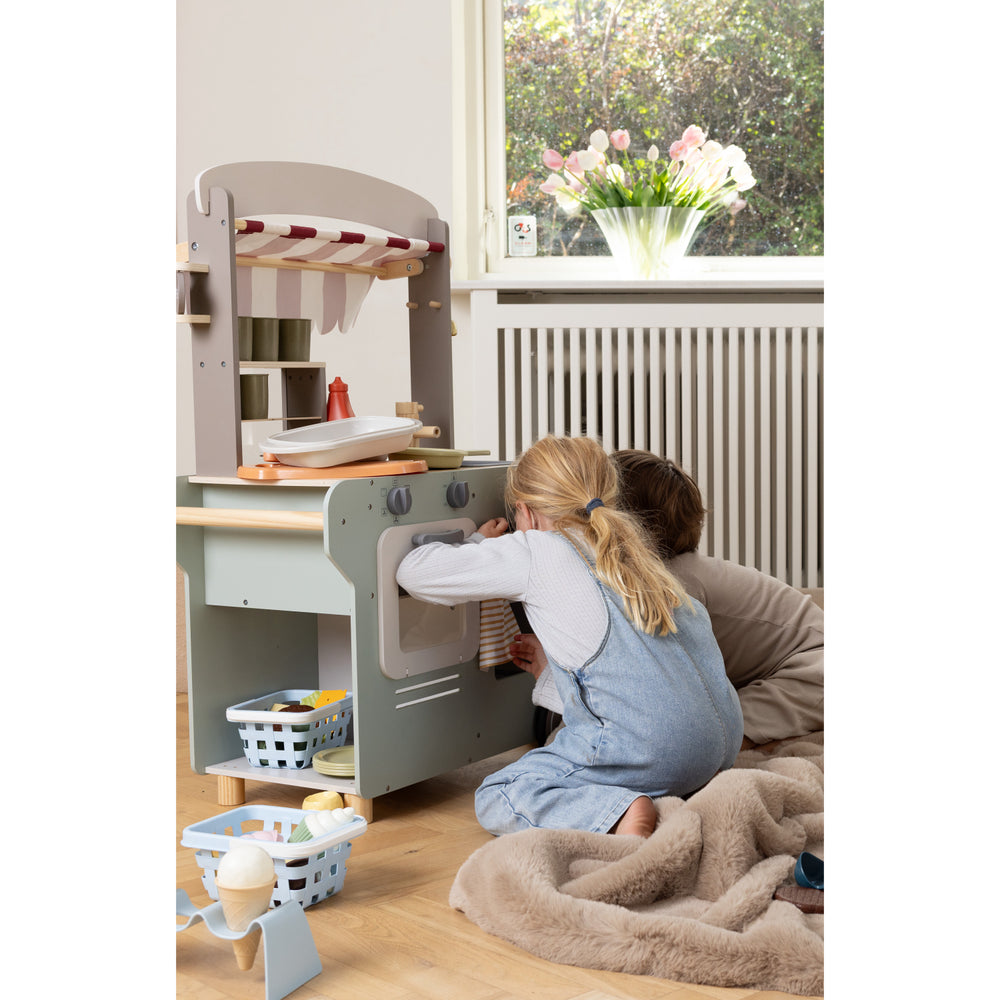 Dessutom ger klockan och den tydliga skylten "STREET FOOD" under den randiga markisen en autentisk känsla till barnens eget matstånd, vilket uppmuntrar till timmar av engagerad lek med familj och vänner.
