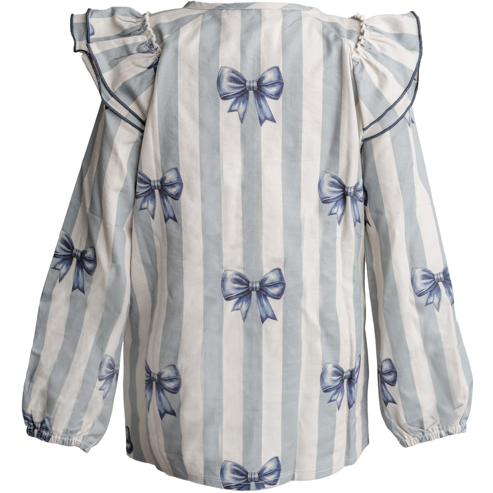 Upptäck charmen hos Hanevild Rainy Rosett Skjorta, perfekt för varje barns garderob. Denna skjorta är tillverkad av 100% mjuk bomull och har en unik design med en volangkrage som elegantly ramar in halsen och axlarna. Dess ljusblåa ränder och sirliga rosettmönster gör den till ett blickfång. Skjortan är skonsam mot huden och lättskött, tvättas enkelt vid 30 grader och ska läggas platt för torkning. Klä upp din lille med stil och komfort för alla tillfällen.