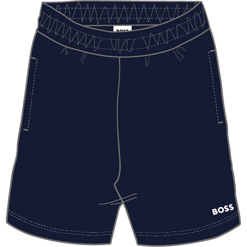 Dessa smarta Hugo Boss shorts i marinblått är perfekta för aktiva dagar. De är tillverkade av mjuk bomullspolyesterfleece och garanterar hög komfort, samtidigt som resåren i midjan ger en bra passform. Med praktiska sidofickor och en snygg vävd logotyplapp samt BOSS-logotypen tryckt på sidan är dessa shorts inte bara bekväma utan också supertrendiga för små modemedvetna barn. Här får du både stil och funktionalitet i en och samma produkt!