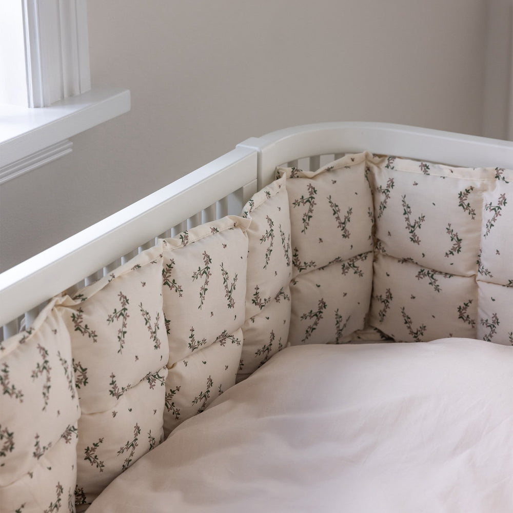 Sebra Powder Blossom Baby Bumper Kapok är perfekt för en trygg och skön sömn för ditt barn. Denna sängkant är designad för att passa både Sebra Bed, Baby & Jr. och standardspjälsängar på 60 x 120 cm. Den vackra unisex designen med delikata blommiga rankor på en ljus krämfärgad bakgrund gör den idealisk att användas och äras av flera barn i familjen. Tillverkad av kapok, en naturfiber med antibakteriella egenskaper som avvisar dammkvalster, är den ett utmärkt val för allergiker och har dessutom temperaturreglerande förmågor. Sängkanten är enkel att underhålla; den är maskintvättbar vid 40°C och bör torktumlas enligt skötselsinstruktionerna. Denna produkt, som är designad i Danmark, är inte bara praktisk utan också en utmärkt presentidé som förenar estetik med funktionalitet.