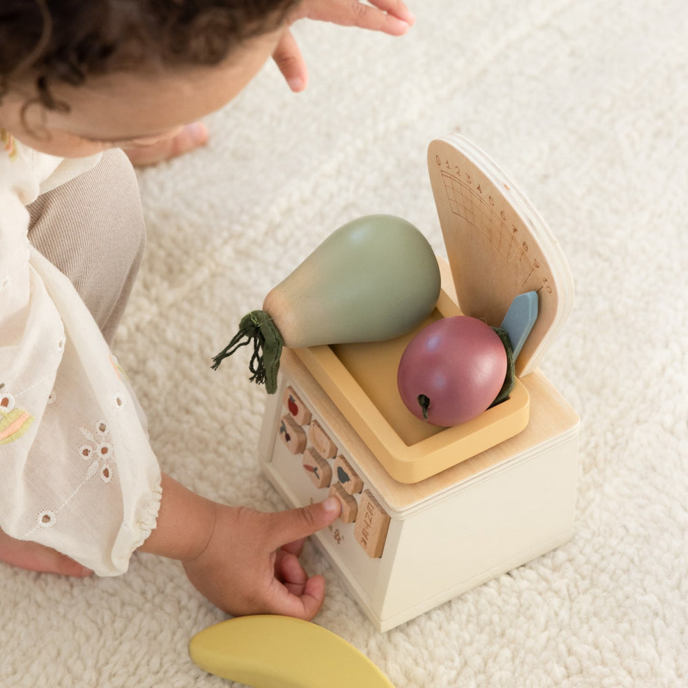 - Extra: Låt ditt barn leka butiksinnehavare med den här charmiga butiksvågen i certifierat trä. Den är perfekt för fantasifull lek med frukt och grönsaker och oändlig kreativitet.