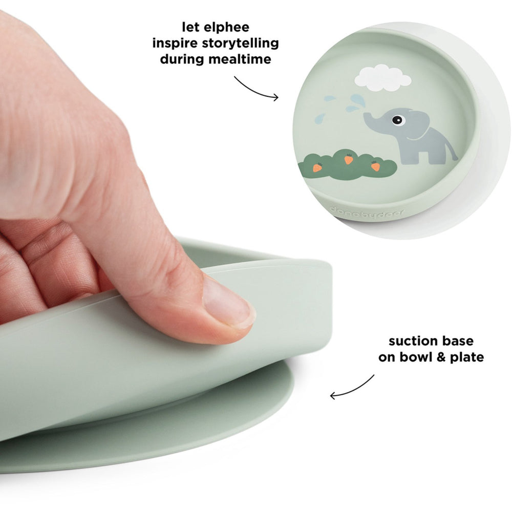 Upptäck DonebyDeer Elphee Green Stick&Stay Matsalsset, designat för att göra måltiderna roligare och mindre röriga för både barn och föräldrar. Matsalssettet, med sina innovativa sugkoppsbottnar, håller tallrikarna stadigt på plats för att minska spill. De höga kanterna underlättar för barnet att själv skopa upp maten, vilket främjar självständighet vid måltiderna. Tillverkat av 100% livsmedelsklassat, BPA-fritt silikon är detta set tryggt för ditt barn att använda dagligen. Det är även anpassat för användning i mikrovågsugn, ugn, frys och är lätt att rengöra i diskmaskin. Det mjuka silikonmaterialet ger ett stabilt grepp och är naturligt halkfritt, perfekt anpassat för små händer. Med detta matsalsset kan ditt barn njuta av varje måltid med största möjliga komfort och säkerhet, samtidigt som det stimulerar till lärande och utveckling genom självständigt ätande.