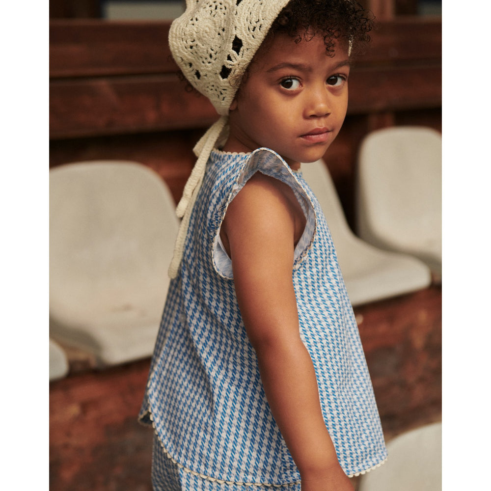 Upptäck vårt charmiga COPENHAGEN COLORS Blue Houndstooth Mini Houndstooth Deco Sett för barn, det perfekta valet för sommarens lek och upptåg! Detta söta set består av en ärmlös topp med lekfulla volanger och en passande shorts, båda designade i ett iögonfallande blått hundtandsmönster som både är stilfullt och roligt. Tillverkade i 100% GOTS-certifierad mjuk bomull, erbjuder dessa plagg utmärkt komfort och andningsförmåga. Toppen pryds av tygtäckta knappar och vågiga detaljer längs fållen, vilket tillför en charmig touch. Setet är tillgängligt i två eleganta färger, som ger en snygg look som passar alla tillfällen. Idealisk för dagligt bruk eller speciella tillställningar, det är ett hållbart och lättvårdat val som säkerställer att ditt barn alltid ser sitt bästa ut.