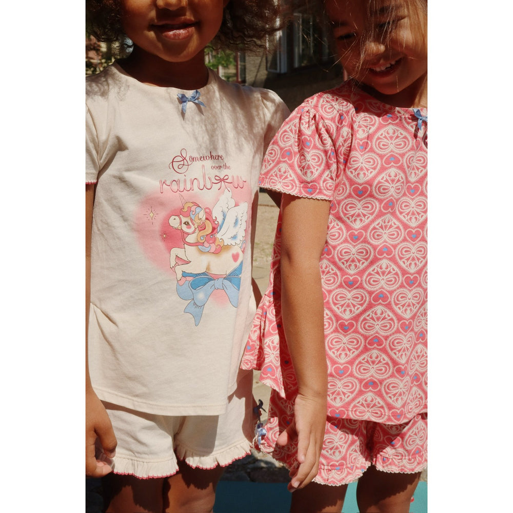 Förnya din lilla stjärnas garderob med Konges Sløjd Lacy Lace Famo Frill Set. Detta charmiga tvådelade set består av en matchande T-shirt och shorts med söta volanger, perfekt för lekfulla dagar. Tillverkat av 100% ekologisk bomull är det inte bara mjukt mot huden utan också miljövänligt, GOTS-certifierat under CU1094701. T-shirten är utrustad med praktiska tryckknappar på vänster axel för storlekar upp till 18 månader, vilket underlättar påklädningen. Med dess behagliga passform och lätta skötsel blir detta set snabbt en favorit både för barn och föräldrar.