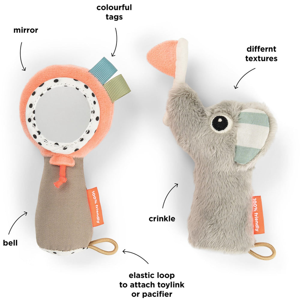 Låt de minsta upptäcka och utforska med DonebyDeer Celebration Colour Mix Sanserangle Med Spegel. Denna charmiga sanserangle är designad för att stimulera barnens nyfikenhet och utveckla deras sinnesförnimmelser. Med sina färgglada detaljer och olika krusningar och skallror, erbjuder leksaken en mångfald av sensoriska upplevelser som uppmuntrar till visuell, taktil och auditiv utforskning.