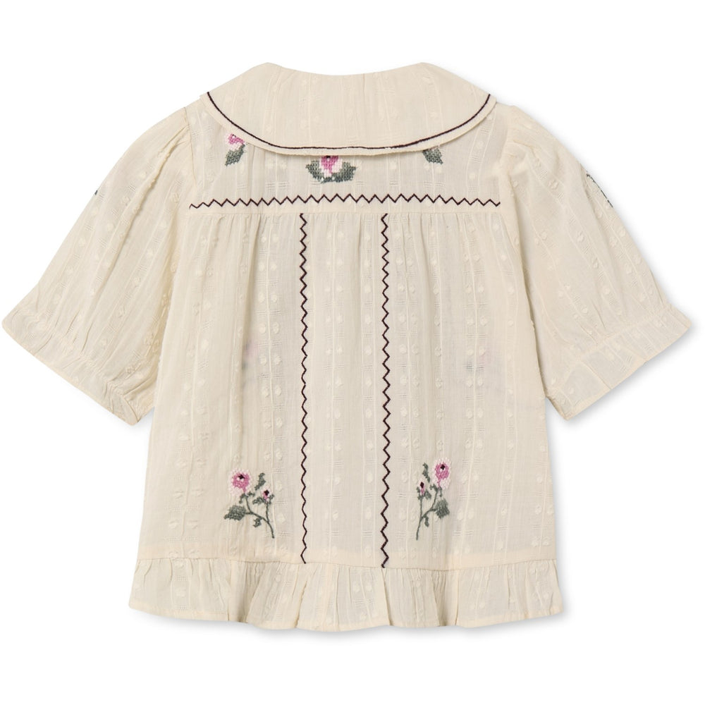 Denna charmiga kortärmade skjorta från Fliink Sandshell är perfekt för att klä upp din lilla prinsessa! Tillverkad i 100% vävd bomull är den både mjuk och hållbar. Designen framhäver delikata broderade rosor och romantiska detaljer som puffärmar och rynkningar vid axlarna. En rundad krage och praktisk knappstängning framtill kombinerat med en feminin volangkant nedtill kompletterar det estetiska intrycket.