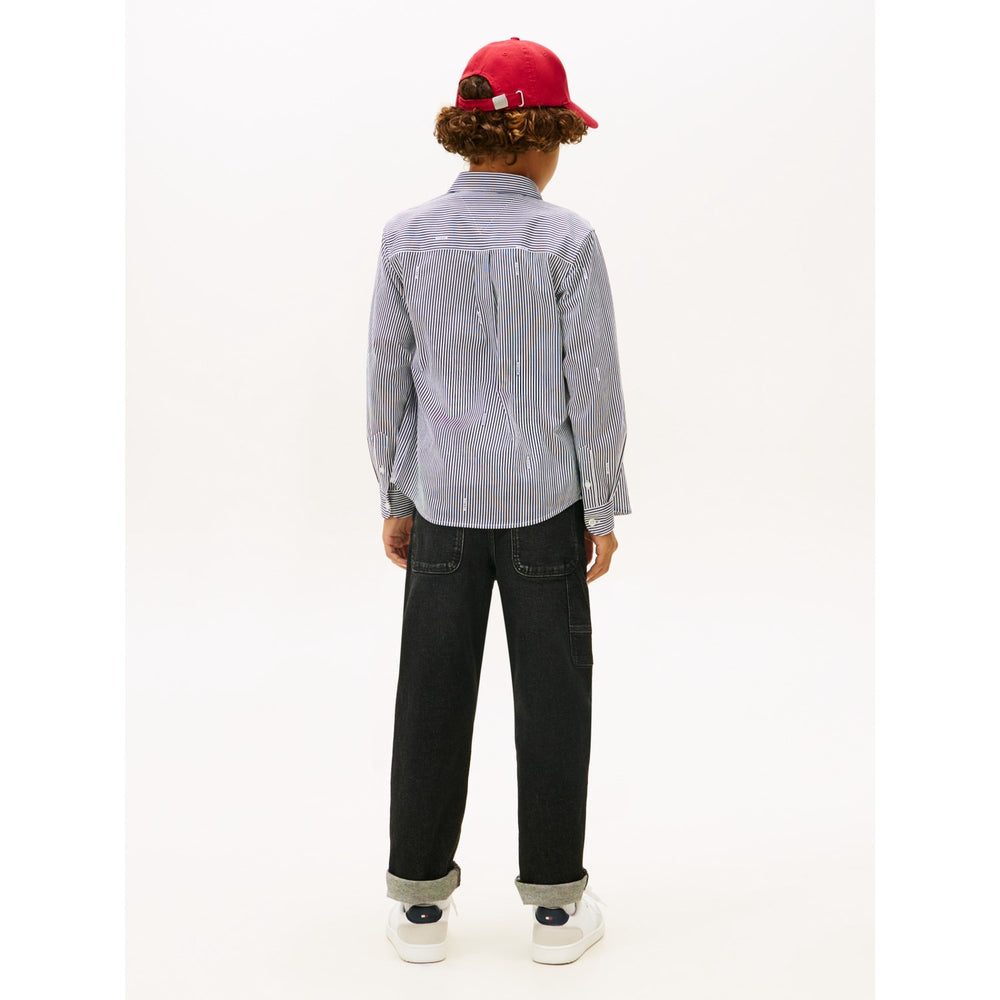 Upptäck stilkänslan hos barn med Tommy Hilfiger Dark Night Navy White Stripe Aop Jersey Skjorta. Tillverkad i mjukt jersey-material som kombinerar komfort med hållbarhet, är denna skjorta både stilren och bekväm för alla tillfällen. Den mörkblå basen med vita ränder och diskret logotyp ger en klassisk men modern look. Perfekt för både vardag och fest, och dess underhållsvänliga material gör den lätt att tvätta och hålla fräsch. Idealisk för det modeintresserade barnet som behöver rörelsefrihet och stil. Material: Bomull under omvandling (100 %)