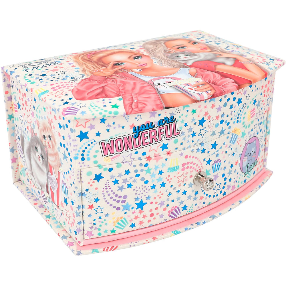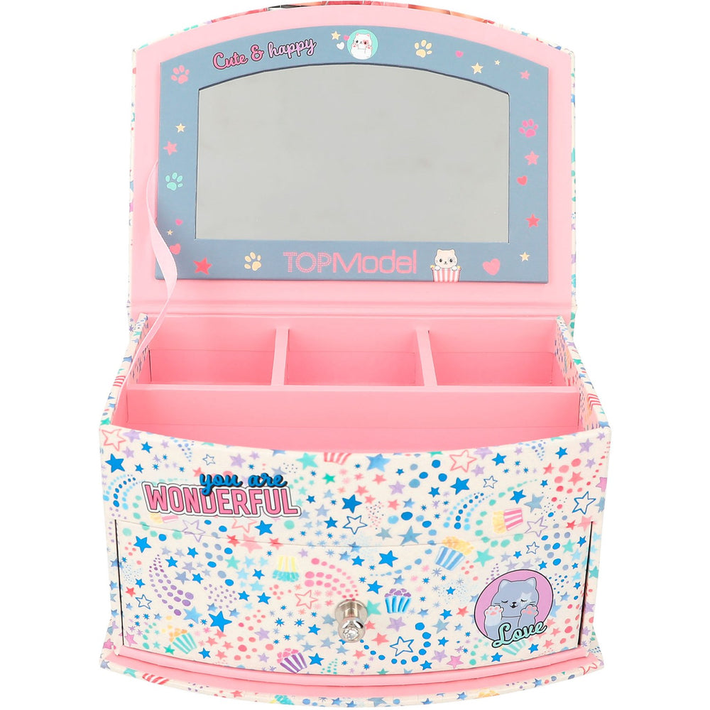 Ge ditt barn en plats för dyrbara skatter med det underbara TOPModel Smyckeskrin Cutie Star. Detta smyckeskrin är inte bara ett blickfång med sina lekfulla stjärnor, charmiga popcornmotiv och bedårande kattungar, men det öppnar också upp en värld av ordning och fantasi. Med en smart designad spegel i locket och flera praktiska fack, är det lätt att hålla små skatter både synliga och organiserade.