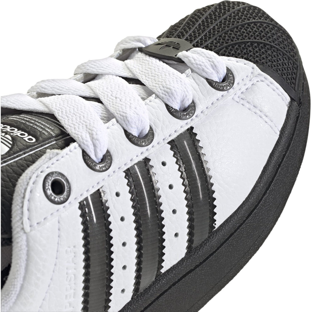 - Extra: Tandad 3-stripes, Superstar box-logotyp på plösen, Trefoil-logotyp på hälfliken.