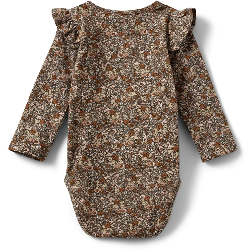 - Extra: • Brun blommönstrad body med små ankor • Långa ärmar och söta volanger på axlarna. • Tillverkad av en blandning av bomull, modal och spandex.