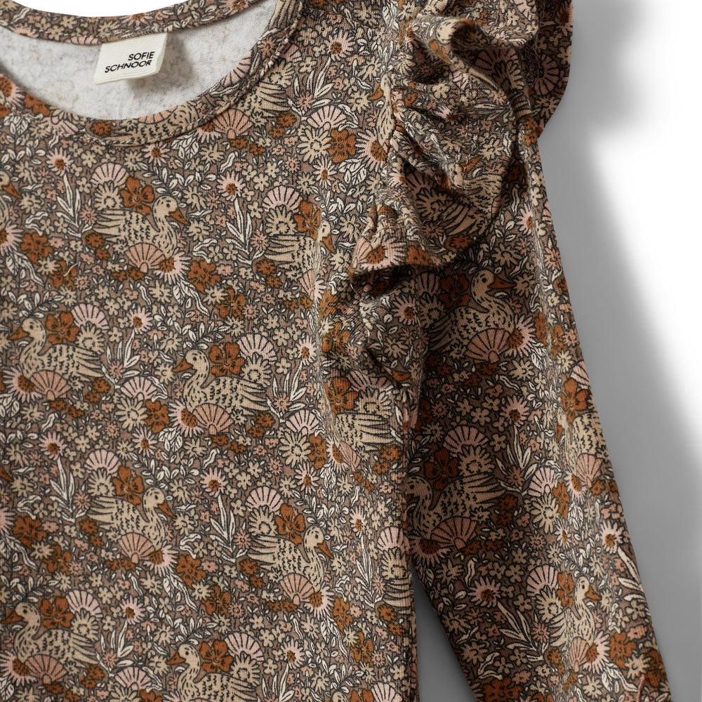 Upptäck Sofie Schnoors charmiga "DicteSB" kroppsstrumpa som kommer att få varje liten att glänsa! Designad med ett iögonfallande brunt blommigt tryck och små, söta ankor som ger en rolig twist. De långa ärmarna och söta volangerna på axlarna ger en touch av eleganta detaljer. Denna bekväma kroppsstrumpa är gjord av en mjuk blandning av bomull, modal och spandex, perfekt för lek och små äventyr under hela dagen!
