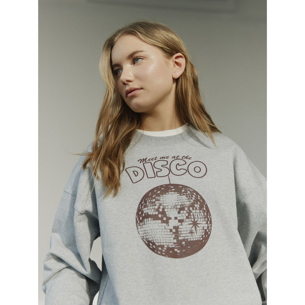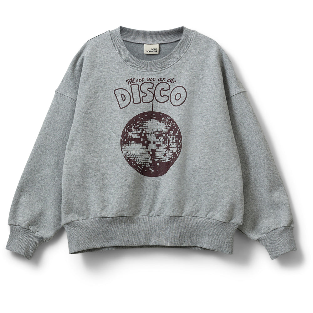 Upplev komfort och stil med Sofie Schnoors 'EliSY' sweatshirt i gråmelerad ton. Den här lätta tröjan har en klassisk rund halsringning, långa ärmar och ribbade kanter för extra hållbarhet. På bröstet pryder sig ett roligt tryck med texten "Meet me at the disco" och ett discokulemotiv som ger en lekfull touch. Perfekt för dagligt bruk, där både komfort och stil är av största vikt. Material: 97% Bomull 3% Elastan Tvättråd: Kom ihåg att följa tvätt- och användarinstruktioner Tröja i grått Ljus kvalitet Rund halsringning Långa ärmar Ribbad fåll Tryck på bröstet med texten "Meet me at the disco" och ett motiv av en discokula