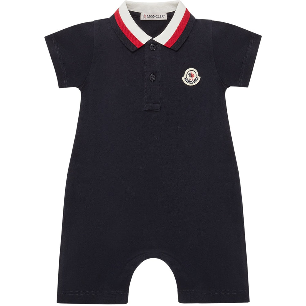 Håll din lilla mysig och snygg i denna Moncler Navy Romper ! Den här sparkdräkten är designad med mjuk bomullspiquet och kramar försiktigt om ditt barn och komfort. Den har en klassisk silhuett i polostil och är förstärkt med eleganta trefärgade kanter för en perfekt touch av elegans. Denna söta outfit är ett viktigt val för vardagsbruk och kombinerar mode med funktion för att hålla ditt barn både bekvämt och trendigt.