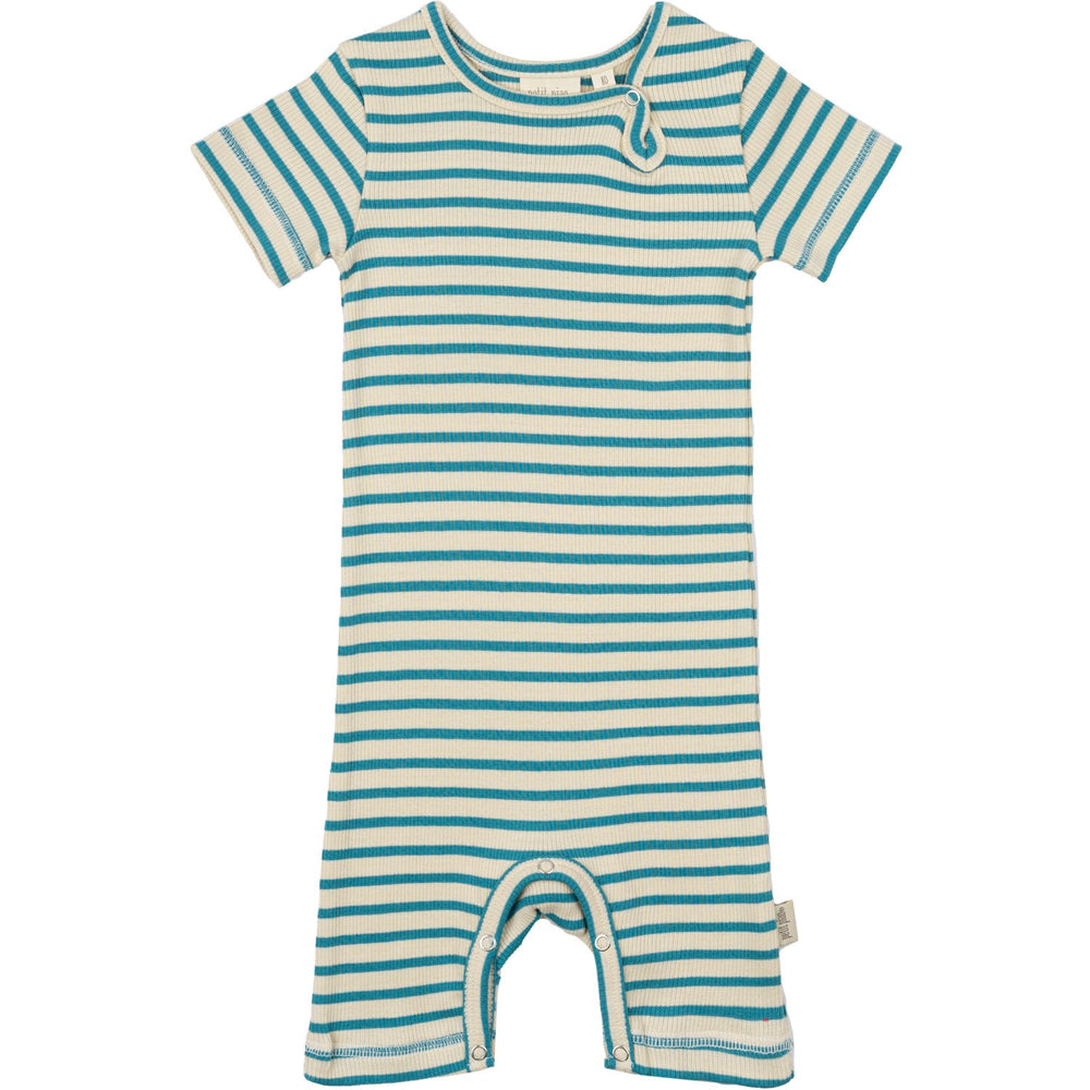 Denna charmiga sommarkostym från Petit Piao i en fräsch turkos och mörk benvit rand är perfekt för soliga dagar fulla av lek och skoj! Med en smart tryckknapp i nacken och fem tryckknappar i innersömmen är den designad för enkel påklädning och snabba blöjbyten. Den är tillverkad av ett mjukt, stretchigt ribbat tyg och garanterar ultimat komfort och frihet att utforska världen. Ett måste i sommargarderoben!