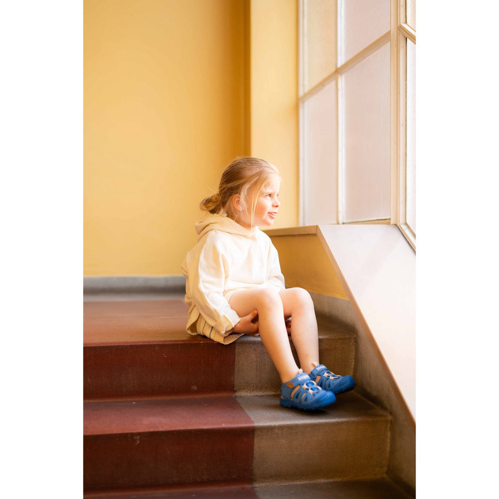 Ge ditt barn den ultimata sommarupplevelsen med Bisgaard Cobalt Parker Sandalen. Denna öppna design med sitt charmiga koboltblåa mönster inte bara ser bra ut utan erbjuder även högsta komfort och hållbarhet. Tillverkade i slitstarkt material som andas väl, garanterar dessa sandaler att ditt barns fötter hålls fräscha och bekväma under alla deras sommaräventyr. Passformen är perfekt anpassad för små växande fötter, och kan enkelt justeras för att ge optimalt stöd. Lättvårdade och designade för allt från lek i parken till en dag på stranden, är Parker Sandalen ett måste för barnens sommargarderob.