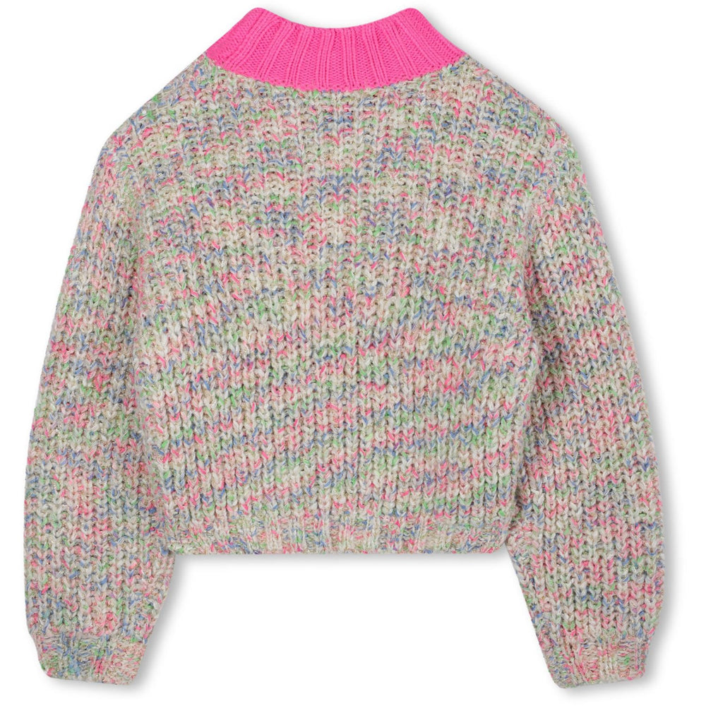 Upptäck äventyret med denna charmiga Billieblush pullover! Den här stickade tröjan är vävd med flerfärgade formpressade trådar och en blank tråd som ger en magisk lyster. Den rosa kontrastkragen ger en färgklick, medan den udda etiketten ger en lekfull touch. Perfekt för att hålla din lilla fashionista både varm och snygg!