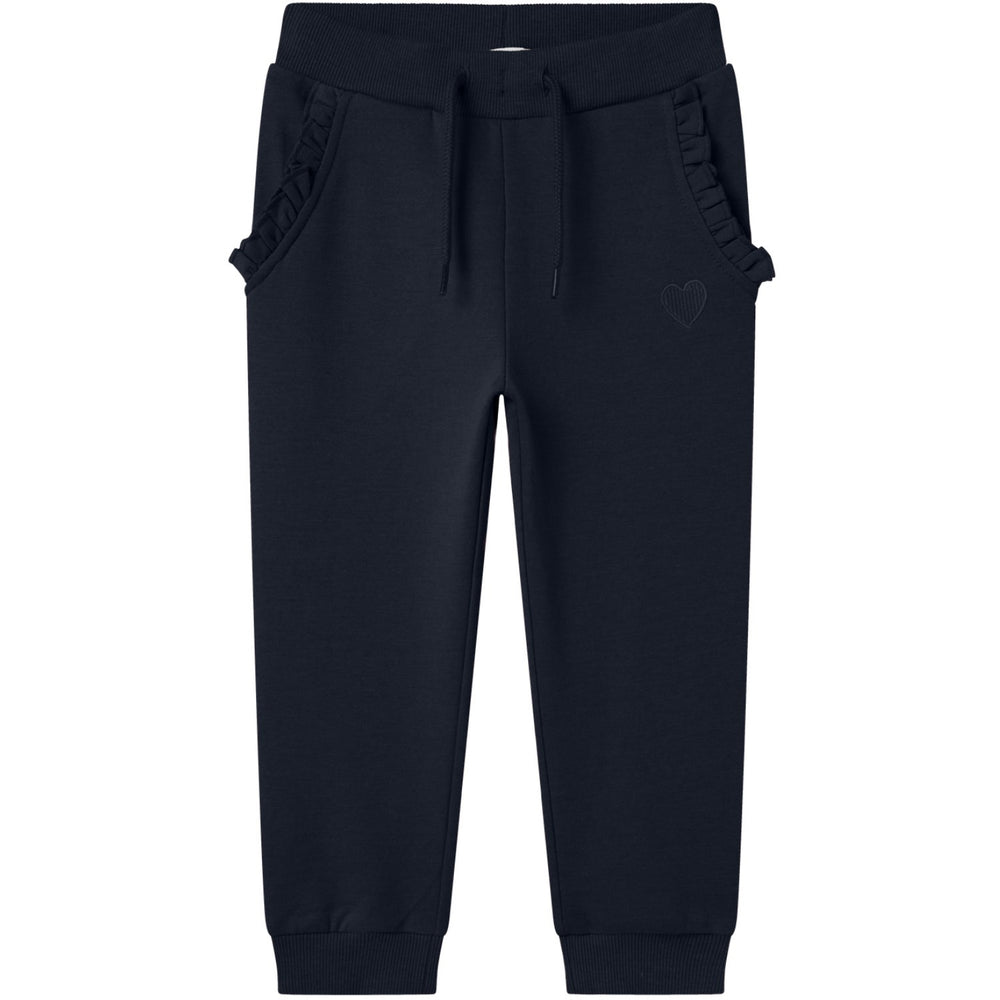 Upptäck våra mångsidiga **Name It Dark Sapphire Nmfvima Swe Byxor Bru Noos**, perfekta för alla barns lekfulla vardag. Dessa träningsbyxor är tillverkade i mjuk, borstad svettduk med en behaglig insida, vilket ger optimal komfort under aktiva dagar. Det moderna mörkblåa utförandet med fina detaljer som justerbar midja, snyggt broderi och charmiga volanger ger en stilfull touch. De praktiska sidofickorna förbättrar funktion och användbarhet. Med normal passform sitter byxorna bekvämt på ditt barn, samtidigt som de erbjuder rörelsefrihet vilket är essentiellt för barn i alla åldrar. Skötselråden är enkla: dessa byxor bör förvaras åtskilt från eld för att bevara material och design. Vare sig det är för skola, lek eller familjeutflykter, är dessa byxor ett utmärkt val som kombinerar stil med praktisk användning, vilket gör dem till en väsentlig del av ditt barns garderob.