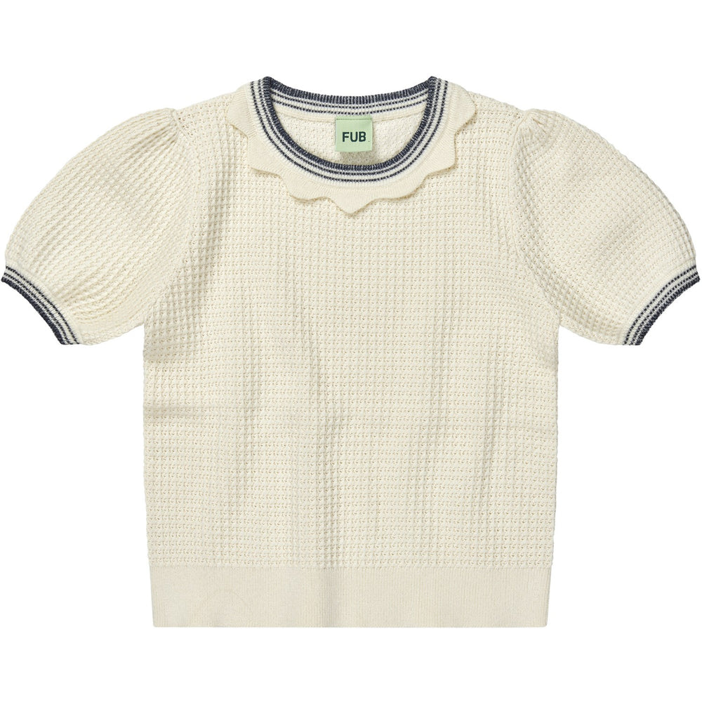 Upptäck vår charmiga FUB ecru Structure Tee – en favorit för alla barns garderob! Tillverkad av 100% certifierad ekologisk bomull, garanterar denna t-shirt inte bara en mjuk och behaglig känsla utan också en miljövänlig produktion. Med dess unika grafiska struktur och stilfulla designelement såsom korta vida puffärmar samt en attraktiv randig halsringning med stickad spetskant, erbjuder den en oslagbar kombination av stil och komfort. Ribbade ärmslut med dekorativa ränder fulländar dess estetiska utseende. T-shirten är skapad för att hålla och är lätt att sköta vilket gör den till ett praktiskt val för vardagligt bruk. Dess normala passform och skonsamma material gör att den passar utmärkt till lek och äventyr. Känn dig trygg med ett köp som är både stiligt och hållbart!