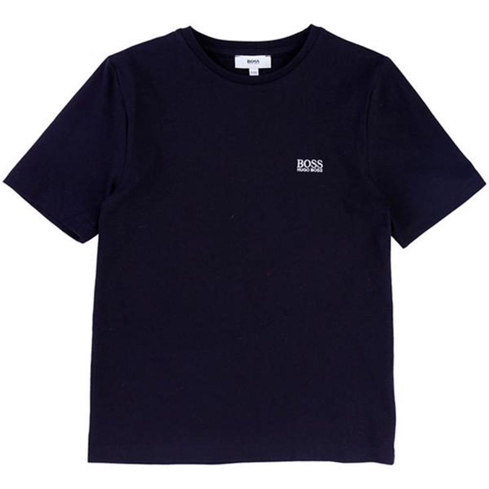 Hugo Boss klassisk mörkblå t-shirt. En superfin t-shirt i bra kvalitet. T-shirten är mörkblå och har en vit klassisk Hugo Boss-logga på bröstet. Det finns tryckknappar i nacken, så t-shirten är lätt att få över huvudet.