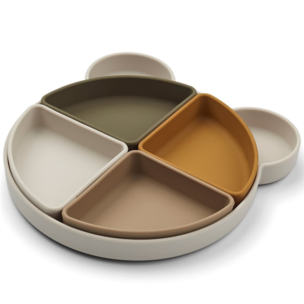Liewood Arne Silikon Opdelt Tallrik med Mr Bear-mönster i Sandy Multi Mix gör måltiderna roligare och säkrare för barn. Med fyra separata skålar uppmuntrar denna tallrik till nya smaker och texturer, vilket hjälper barnet i dess matutforskning. De uttagbara skålarna erbjuder flexibilitet och enkel rengöring, samt är tillverkad av barnsäkert material. Idealisk för att hålla ordning och stimulera sinnen under matningen.