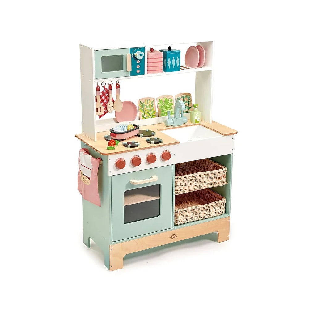Upptäck en värld av kulinarisk fantasi med Tender Leaf Legekøkken, det perfekta leksaksköket för små kockar! Det här detaljerade köket är utrustat med en ugn, inbyggd mikrovågsugn och en rad med fina tallrikar, vilket skapar en idealisk miljö för lekfull inlärning och kreativitet. Tender Leaf Legekøkken är designat med säkerhet och barnvänlighet i åtanke, perfekt för barn från 3 år och uppåt. De mjuka kanterna och de icke-giftiga materialen garanterar att ditt barn kan leka säkert. Köket främjar även barnets utveckling genom dess pedagogiska värde; det uppmuntrar till rollspel som stimulerar både språkutveckling och sociala färdigheter. Detta leksakskök är inte bara roligt utan också praktiskt. Med sin kompakta design och förvaringslösningar som inkluderar två korgar och ytterligare förvaringsfack, är det enkelt att hålla ordning. Köket är enkelt att montera och dess robusta konstruktion gör det enkelt att underhålla, vilket säkerställer långvarig lekglädje. Med Tender Leaf Legekøkken öppnas dörren till oändliga lekmöjligheter där ditt barn kan utforska och utveckla sina talanger i en trygg och lärorik miljö. Ge ditt barn en gåva som både underhåller och utbildar med vårt charmiga leksakskök!