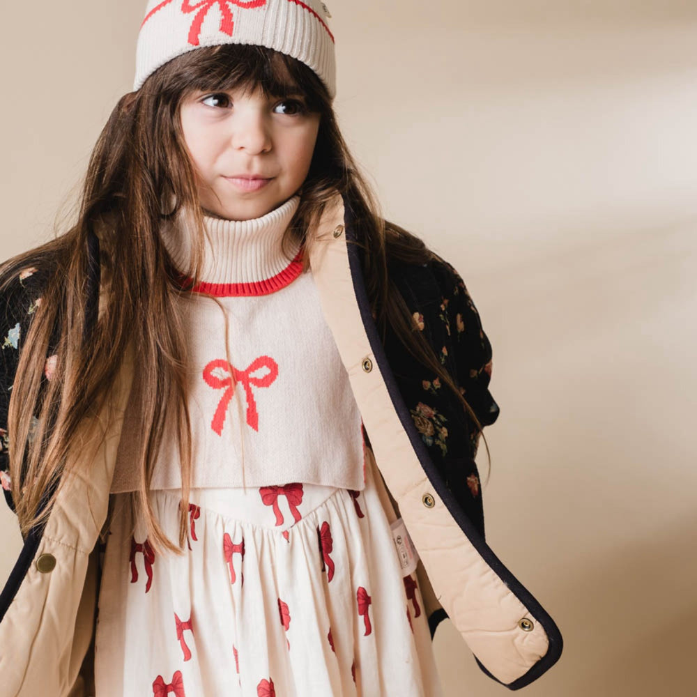 Uppgradera ditt barns vintergarderob med That's Mine Almond Peach Louise Nackvärmare. Denna stiliga halsvärmare är stickad och har en charmig rosett som detalj, vilket gör den både söt och praktisk. Tillverkad av mjuk ekologisk bomull garanterar den komfort och värme under kyliga dagar. Perfekt kombinerat med Leonora-mössan för en komplett och stilsäker look. Lätt att sköta om, är den idealisk för daglig användning och håller ditt barn varmt och bekvämt hela säsongen.
