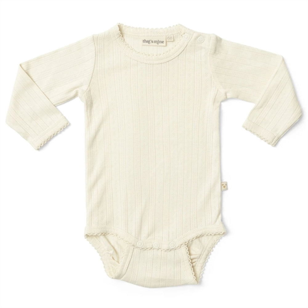 Riktigt fin långärmad body från That's Mine. Den här i en fin benvit med världens vackraste spetsmönster. Bodyn har en justerbar stängning i grenen och på axeln.