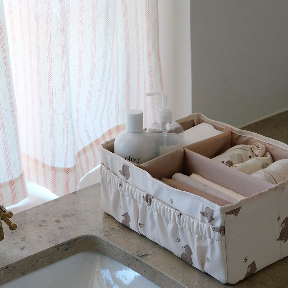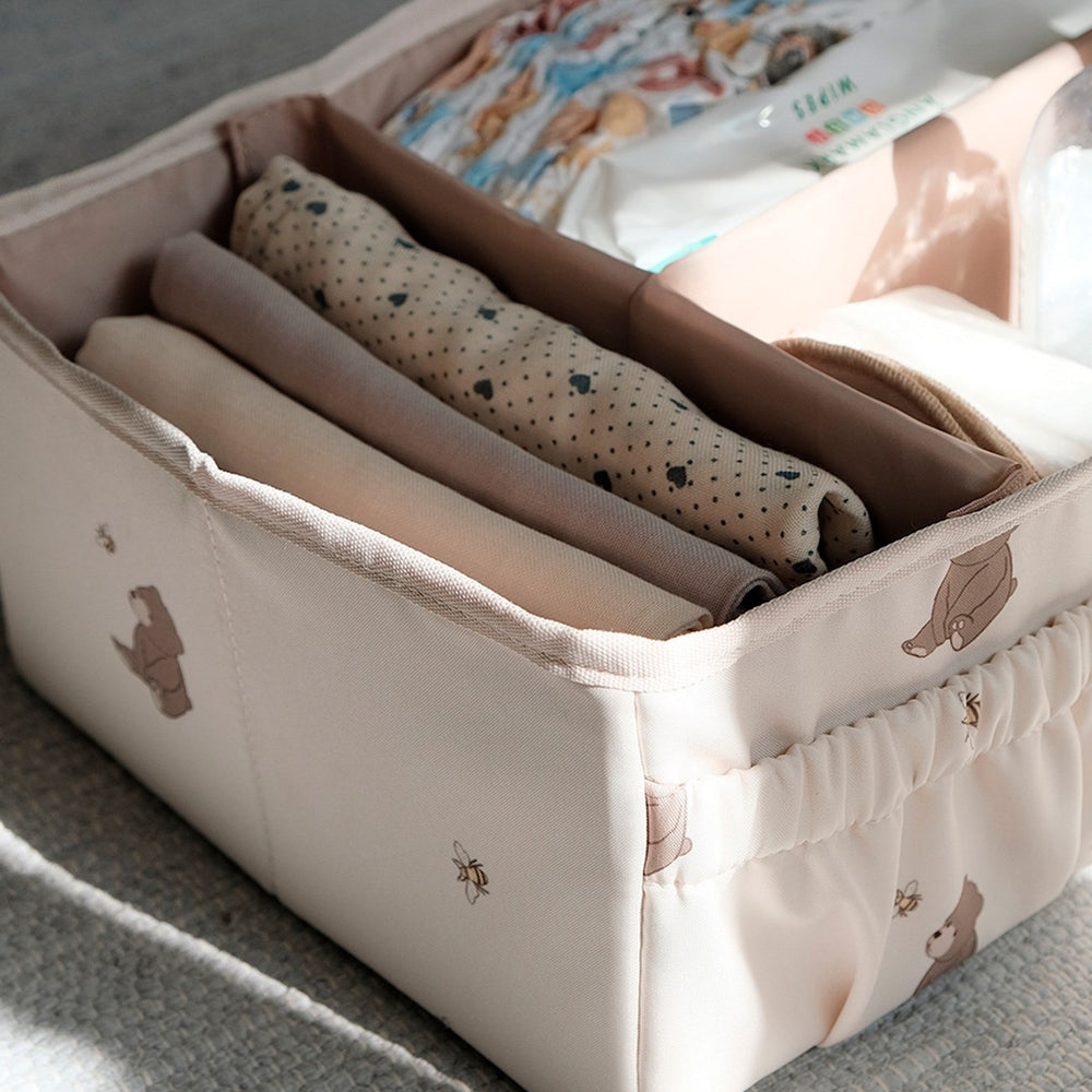 Ge ordning och reda i ditt barns rum med "That's Mine Bees And Bears Lily Nursing Organizer". Denna förvaringslåda är designad för att göra omklädningstiden smidigare och mer organiserad. Lådan är idealisk för att förvara blöjor, krämer och andra nödvändigheter, med ett stort fack utrustat med avtagbara avdelare som kan anpassas till ett stort utrymme eller tre mindre fack. Med praktiska kardborrelås och extra fickor – en stor och två små – håller du lätt ordning på alla småsaker. När den inte används kan du enkelt vika ihop lådan för att spara plats. Måtten är 32 x 22 x 13 cm, vilket gör den både rymlig och kompakt. Skapa en trygg och stimulerande miljö i ditt barns rum med denna funktionella och estetiskt tilltalande förvaringslösning.
