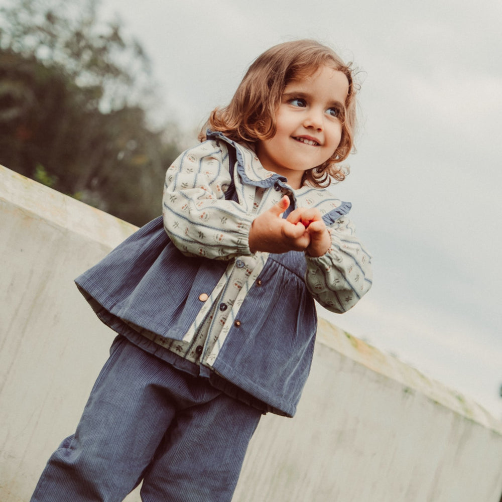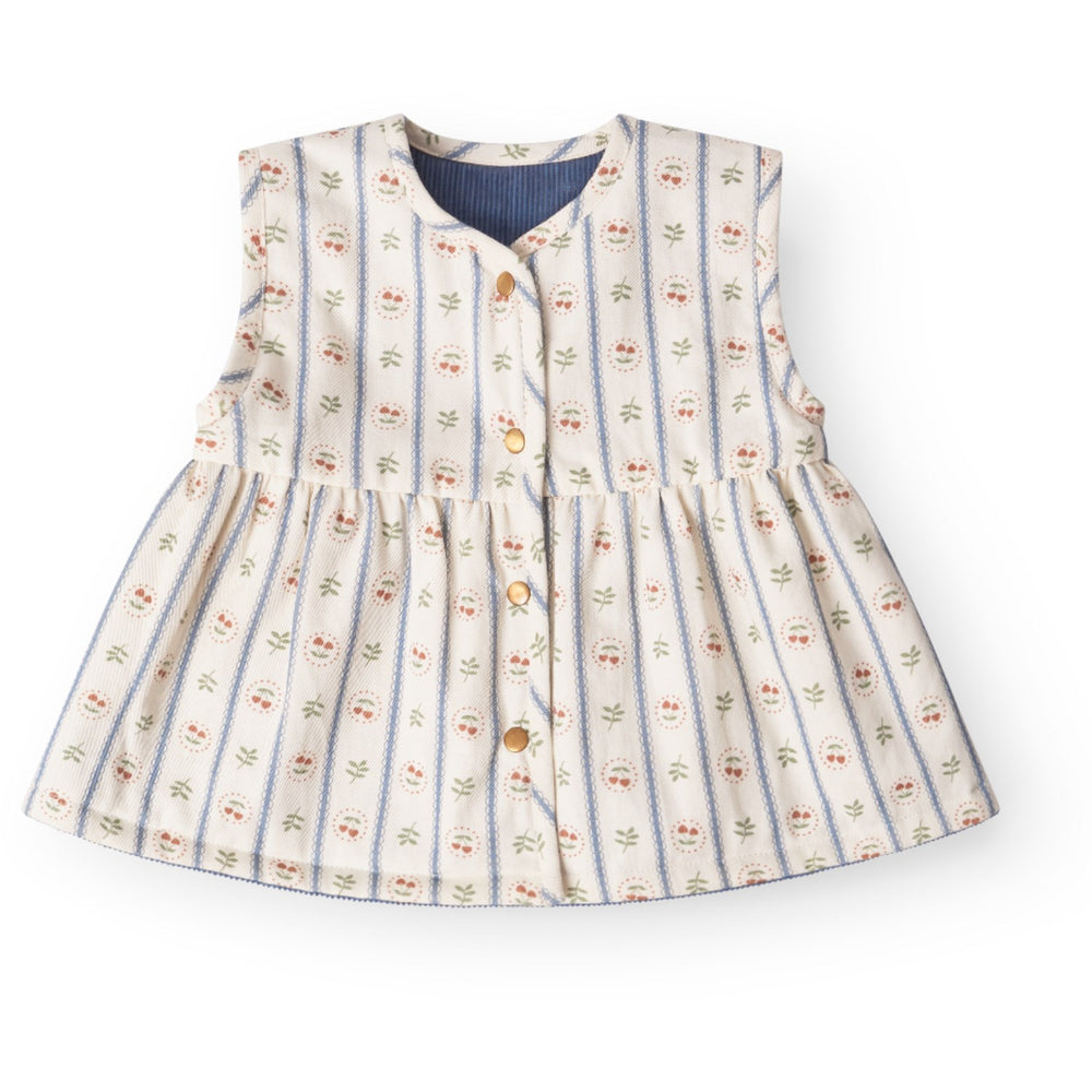 Upplev dubbel stil med "That's Mine Flint Stone Rubi Väst" för barn! Denna charmiga vändbara väst är tillverkad i mjuk manchester kombinerat med ett lekfullt tryckt mönster. Designen inkluderar praktiska knappar fram och en söt hjärtlapp på baksidan. Den är utrustad med en liten ficka och dekorativa rynkor runt midjan, vilket gör den både funktionell och stilfull. Perfekt för att hålla små äventyrare varma med stil!