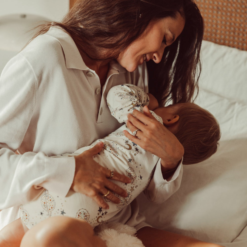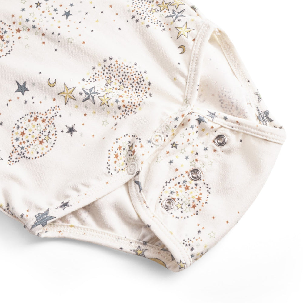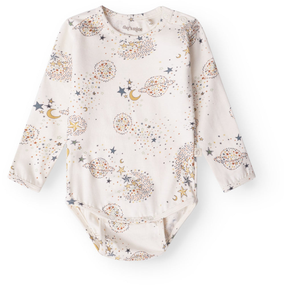 Låt din lilla stjärna lysa i That's Mine Million Stars Ellis Bodystocking. Denna oemotståndligt mjuka bodysuit är tillverkad av en högkvalitativ blandning av bomull och modal, vilket garanterar ultimat komfort. Det unika designen med flera justerbara metallknappar gör att bodysuiten kan växa med ditt barn och erbjuder en praktisk lösning för snabbväxande småttingar. Klädstycket är dekorerat med bedårande stjärnmönster som tillför en charmig touch. Den är perfekt för både lek och vila, vilket gör den till ett utmärkt val för alla tillfällen.