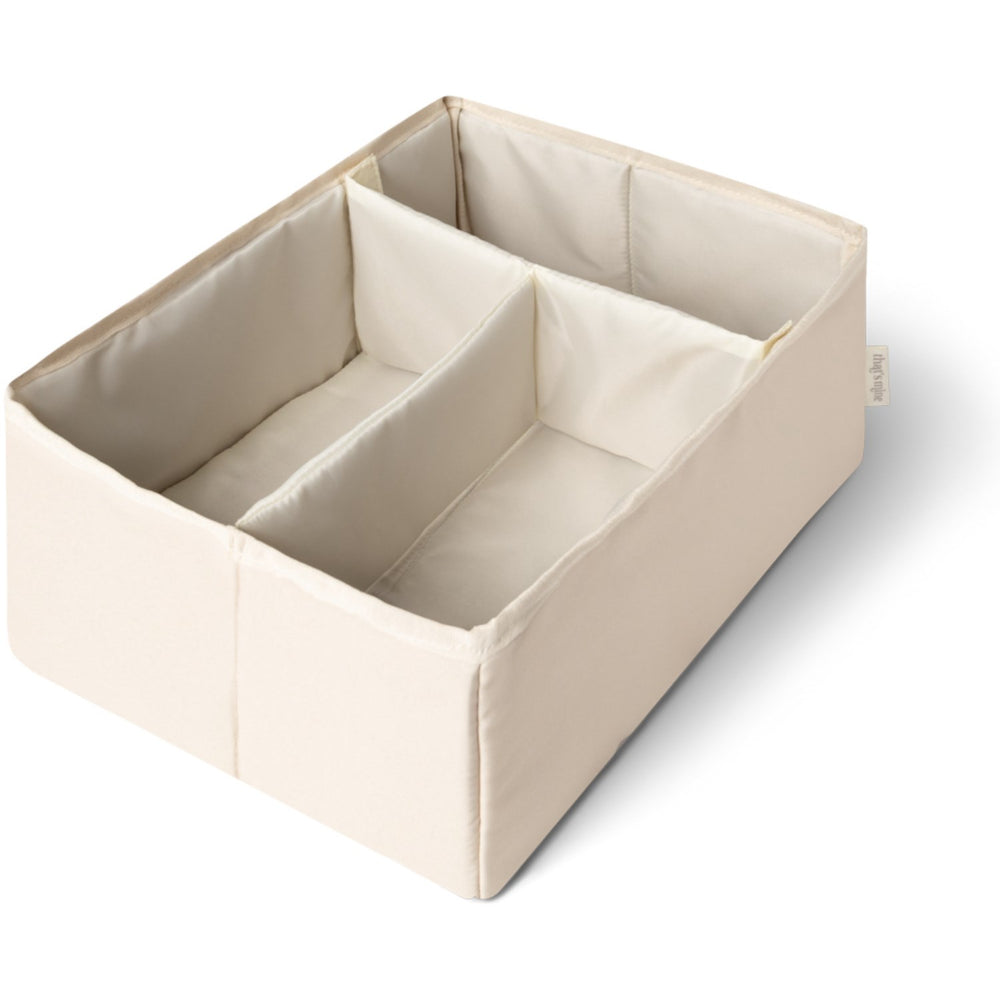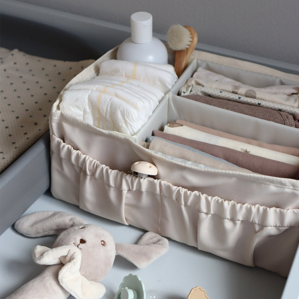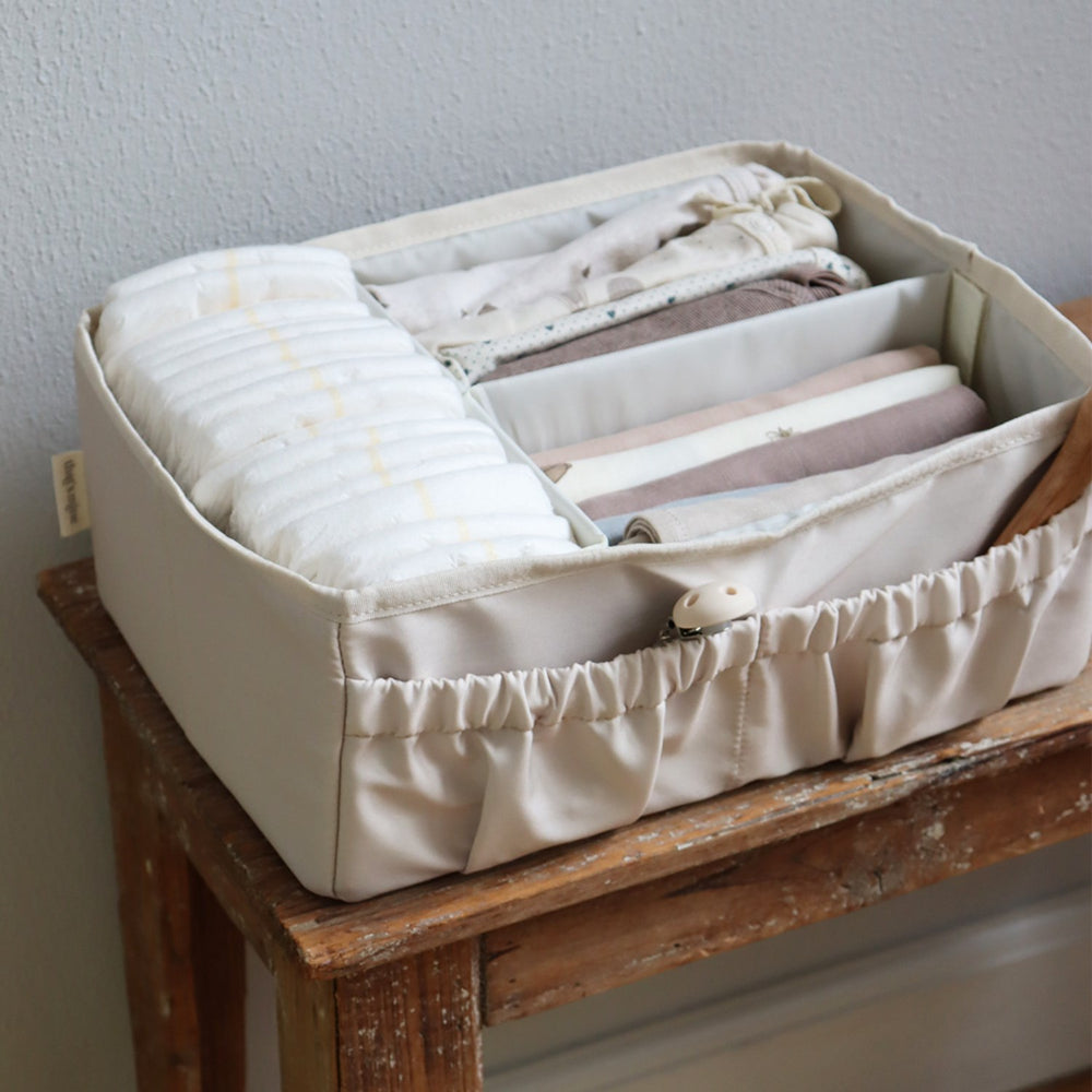Upplev ordning och reda i barnrummet med "That's Mine Peyote Lily Nursing Organizer". Denna förvaringslåda är designad för att underlätta blöjbyten och andra vårdbehov genom praktisk förvaring av blöjor, krämer, och mer. Med ett stort fack som delas av avtagbara avdelare ger den flexibiliteten att anpassas efter dina behov – välj mellan ett stort fack eller tre mindre. Lådans kardborrelås säkerställer att allt hålls på plats, och de ytterligare fickorna erbjuder extra förvaringsmöjligheter. Vill du maximera utrymmet? Lådans ihopvikbara botten gör den enkel att förvara när den inte används. Optimal för ett organiserat och estetiskt tilltalande barnrum där funktionalitet möter design.