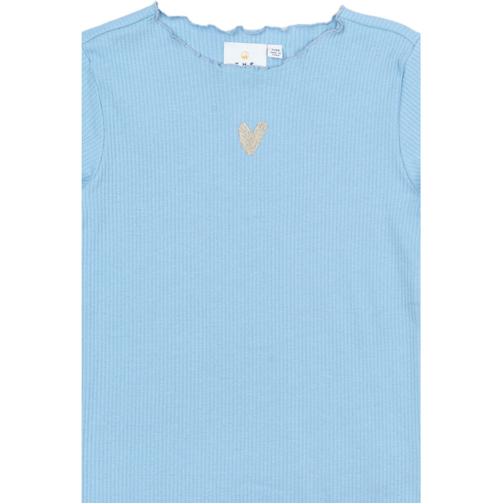 T-shirten kännetecknas av en elegant räfflad struktur och en följsam rund halsringning med lekfulla salladskanter som tillför en fin detalj vid halsen, ärmarna och fållen. En diskret hjärtdetalj på bröstet adderar en söt touch till en i övrigt minimalistisk design.