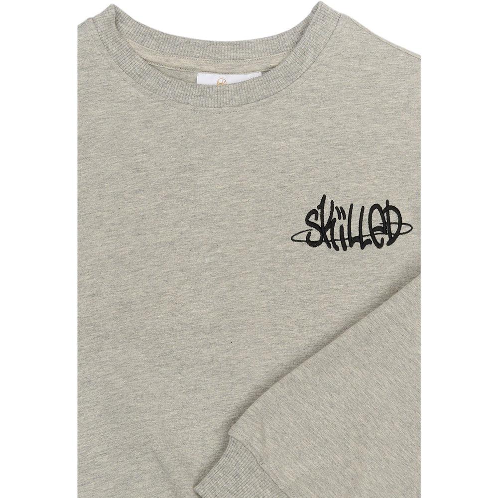 Ge din lilla en trendig och bekväm vardagsstil med THE NEW Light Grey Melange Ron Melange Oversize Sweatshirt. Denna sweatshirt är tillverkad i en mjuk, gråmlerad kvalitet som inte bara ser bra ut utan också känns underbar mot huden. Med sitt oversize-snitt ger den en modern silhuett och fri rörelsefrihet för aktiva barn. Sweatshirten är detaljerad med ribbade kanter vid halsringning, ärmslut och fåll för att hålla formen och öka komforten. På bröstet pryds den av ordet "Skilled" och på ryggen ett stort tryck med samma ord och två blå tärningar, vilket lägger till en lekfull och unik touch. En idealisk valet för kyliga dagar eller som ett snyggt lager ovanpå andra plagg.
