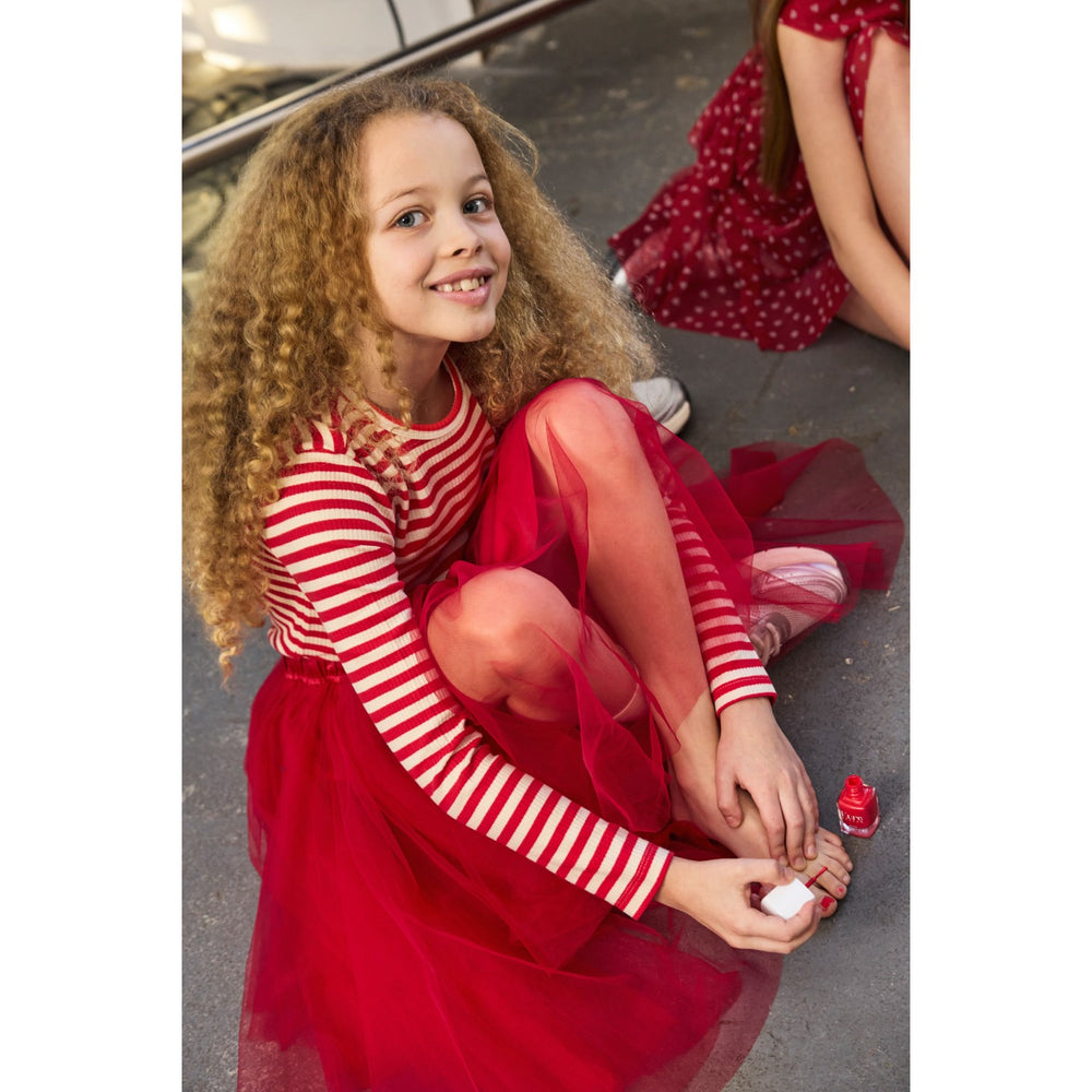 Upplev stil och komfort med "Ski Patrol Striped Moore L_S Rib Tee" från THE NEW, perfekt för ditt barns garderob. Den här långärmade blusen charmar med sina röda ränder och normal passform, vilket gör den både snygg och bekväm för alla tillfällen. Tillverkad i GOTS-certifierad ekologisk bomull, erbjuder den en mjuk känsla mot känslig barnhud och lovar hållbarhet. Den ribbade designen tillsammans med den runda halsringningen adderar en modern twist som är lätt att kombinera med både jeans för en casual look eller en kjol för festligare tillfällen. En mångsidig och miljövänlig tillägg till varje barns klädval!