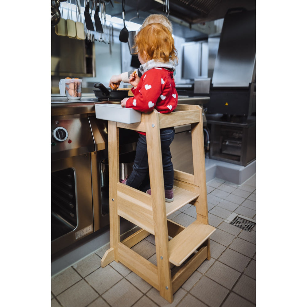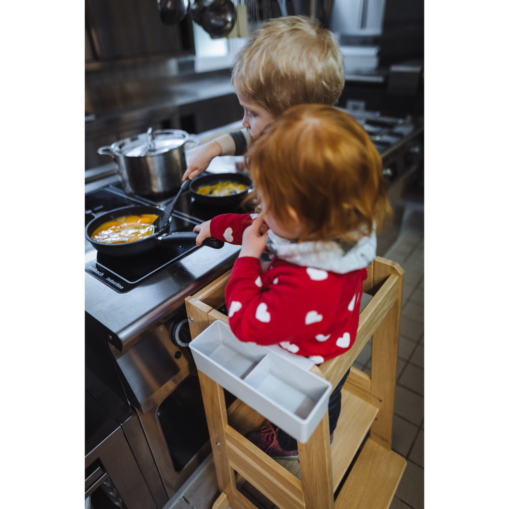 Lådan är inte endast begränsad till lärtornet; dess universella upphängningsanordning passar ytor upp till 2 cm tjocka, vilket gör den idealisk även vid skötbordet eller vid barnsängen. Föreställ dig hur enkel vardagen blir när allt barnet behöver är inom räckhåll, oavsett var i rummet du är.