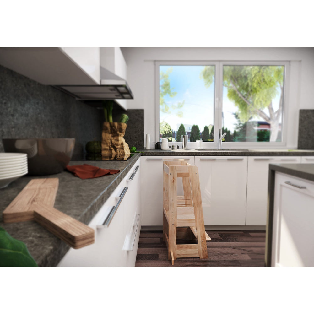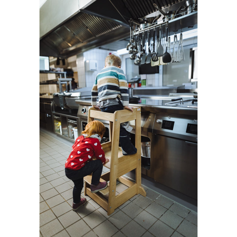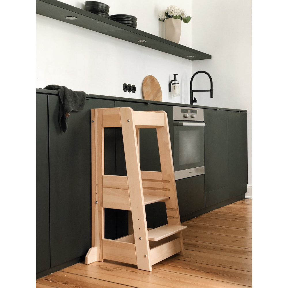 Det funktionella tornet är inte bara ett säkert steg uppåt för att nå köksbänken eller bordet, utan det är också ett estetiskt tillägg till varje inredning med sin naturliga finish i massiv bok. Att lära genom att delta i vuxnas aktiviteter som matlagning eller bakning stimulerar inte bara barnets kognitiva och sociala utveckling, utan stärker även bandet mellan vuxen och barn. Tänk på alla möjligheter och lärande som väntar med tiSsi® Nature Felix Lärande Torn.