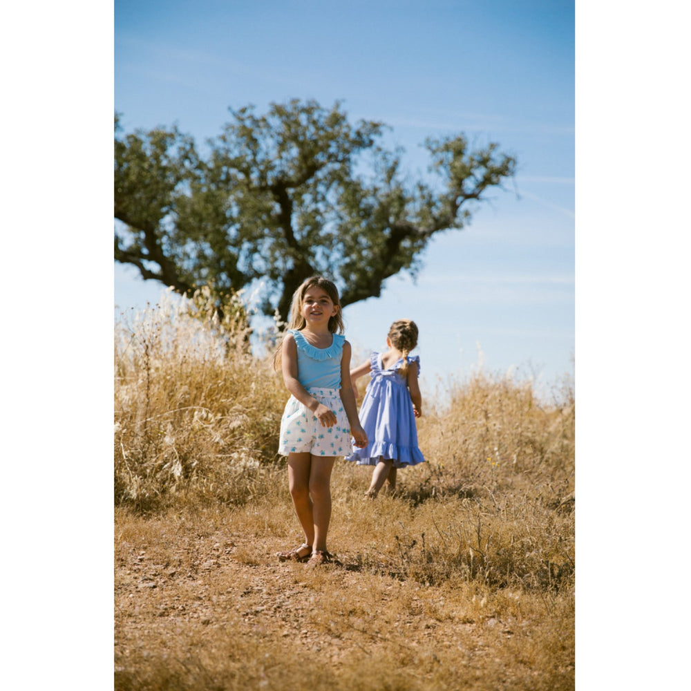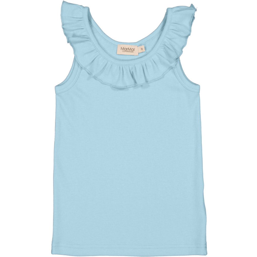 Sval och stilfull, denna ärmfri sommartopp från MarMar är utförd i högkvalitativ modal med fin ribbstruktur, i en himmelsblå nyans som tillför en fräsch touch. Den charmiga volangen längs med toppens kant ger en lekfull och söt stil, perfekt för sommarens äventyr. Toppens mjuka material och sömlösa design garanterar utmärkt komfort och rörelsefrihet för ditt barn, medan enkel tvättbarhet förenklar skötseln. Idealisk för varma dagar, både till vardags och fest.