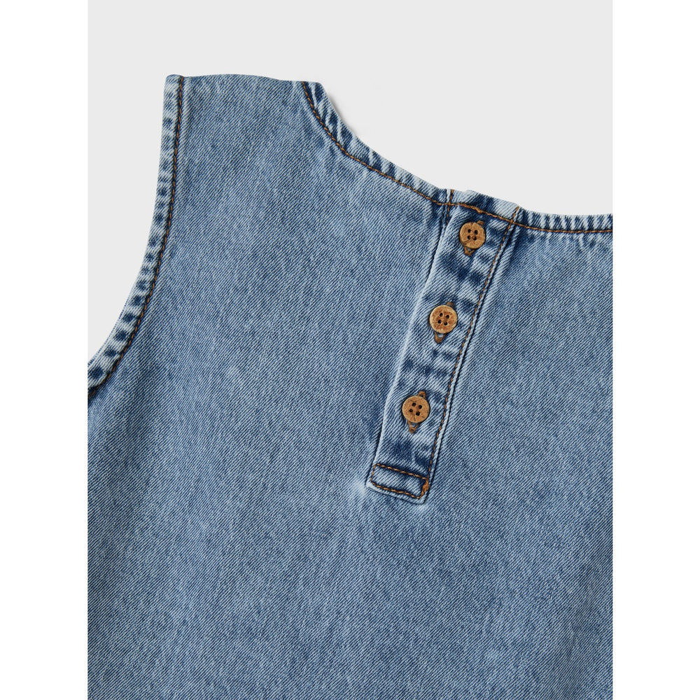 Upptäck den charmiga Amelia Denim Toppen från Name It, idealisk för att skapa en oemotståndlig sommarlook för ditt barn. Denna topp är tillverkad av hållbart, mediumblått denimtyg som kombinerar stil med komfort. Med dess klassiska runda hals och ärmfria design är den perfekt för varma, soliga dagar och balmykvällar.