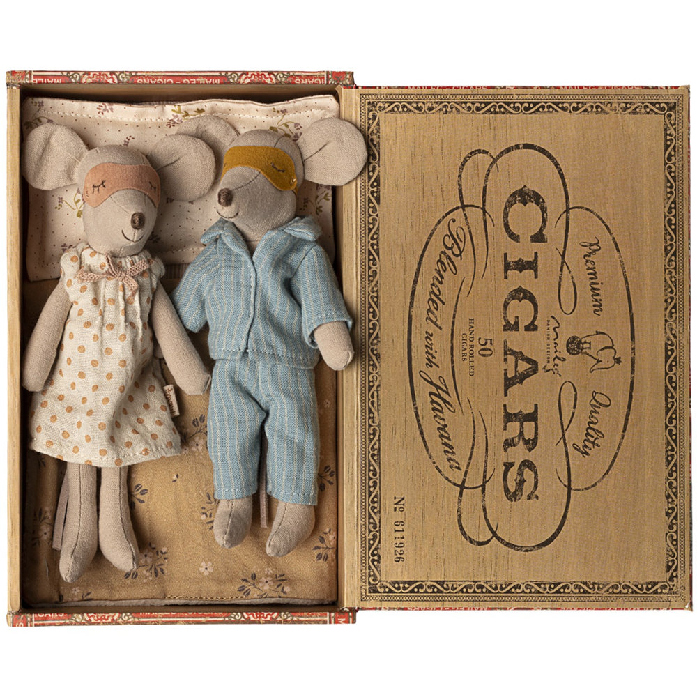 Upplev magin med Maileg Mor & Far Mus i Cigaræske, en charmig leksakssats som är älskad av barn för sin unika design och fantasieggande karaktär. Dessa söta tygdockor kommer klädda i sina fina nattkläder och matchande ögonmasker, redo för en mysig natt. Leksaken är inte bara underhållande utan också säker, tillverkad av högkvalitativa material som är mjuka och hållbara för långvarigt bruk.